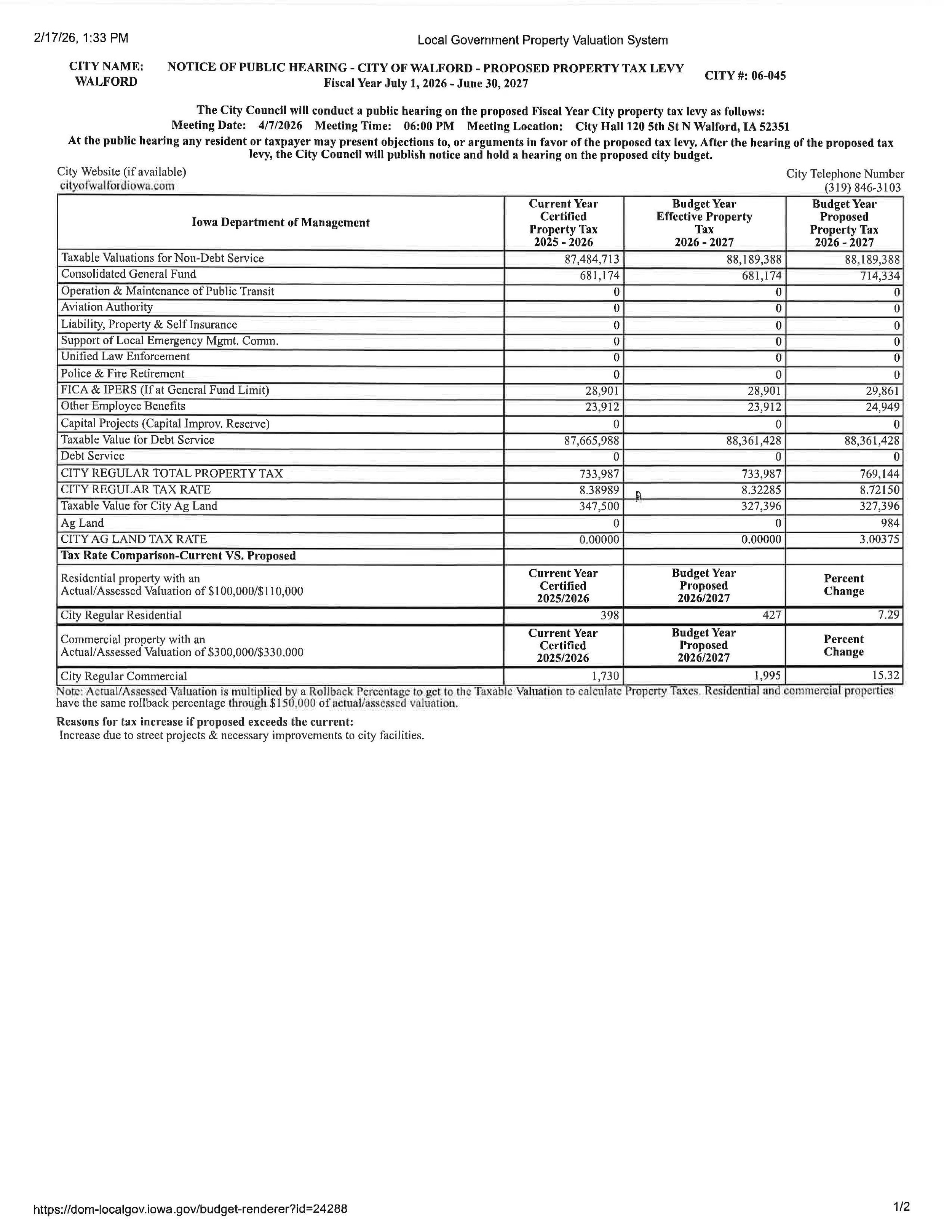 NOTICE OF PUBLIC HEARING - CITY OF WALFORD - PROPOSED PROPERTY TAX LEVY Fiscal Year July 1, 2026 - June 30, 2027